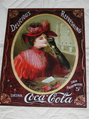 Title (ebay affiliate link): Large Vintage Sytled Coca Cola Coke Tin/Metal Sign/Plaque~Red~Woman~16"x12.5"~3
