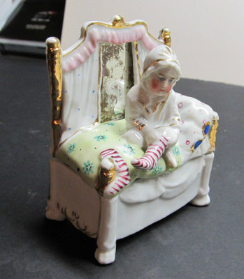 Antique Staffordshire fairing trinket box girl seated on bed NR