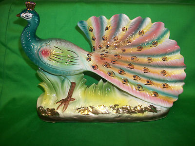 Title (ebay affiliate link): VINTAGE ART DECO PEACOCK PINKS YELLOWS TURQUOISE TRIMMED IN GOLD STATUE