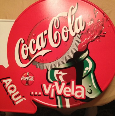 Title (ebay affiliate link): Vintage Wall Mounted Two Sided Tin Coca Cola Sign Aqui Viveka Flange 20"x18"