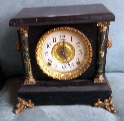 Title (ebay affiliate link): Antique Ingraham Shelf Mantle Clock Two Column Marble Green Brass Feet Ornate ++