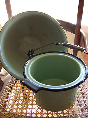 Title (ebay affiliate link): Vintage Primitive Green Enamel Metal Set: Wash Serving Bowl, Milk Bucket Pail