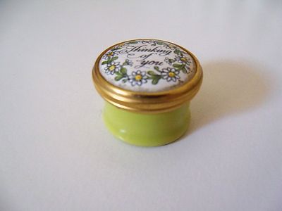Title (ebay affiliate link): HALCYON DAYS ENAMELS THINKING OF YOU LIGHT GREEN PILL BOX MADE IN ENGLAND