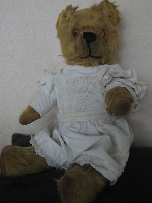 Title (ebay affiliate link): Antique Pedigree Teddy Bear Mohair tag dressed up glass eyes 15" Charlotte nr