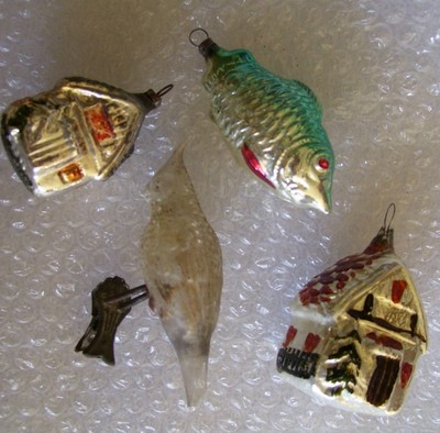 Title (ebay affiliate link): Four Antique Glass Ornaments -- Fish, Clip On Bird and 2 Houses