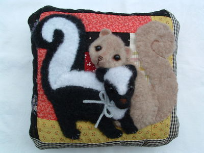 Title (ebay affiliate link): PRIMITIVE FOLK ART ANTIQUE LOG CABIN QUILT PILLOW - SKUNK & SQUIRREL - OOAK