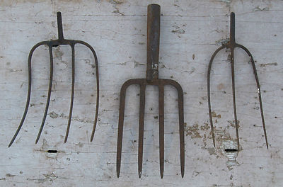 Title (ebay affiliate link): PITCH FORK LOT PRIMITIVE FARM TOOL 3 4 TINE PRONG HAY SILAGE MANURE vintage BARN