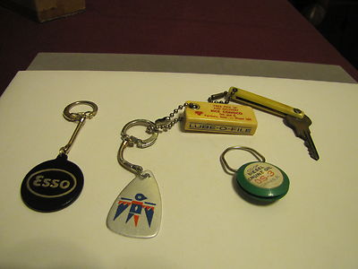 Title (ebay affiliate link): 4 VTG KEY CHAINS~ESSO HAPPY MOTORING~CONOCO CELLULOID LUB-O-FILE~CO-OP+ESTATE