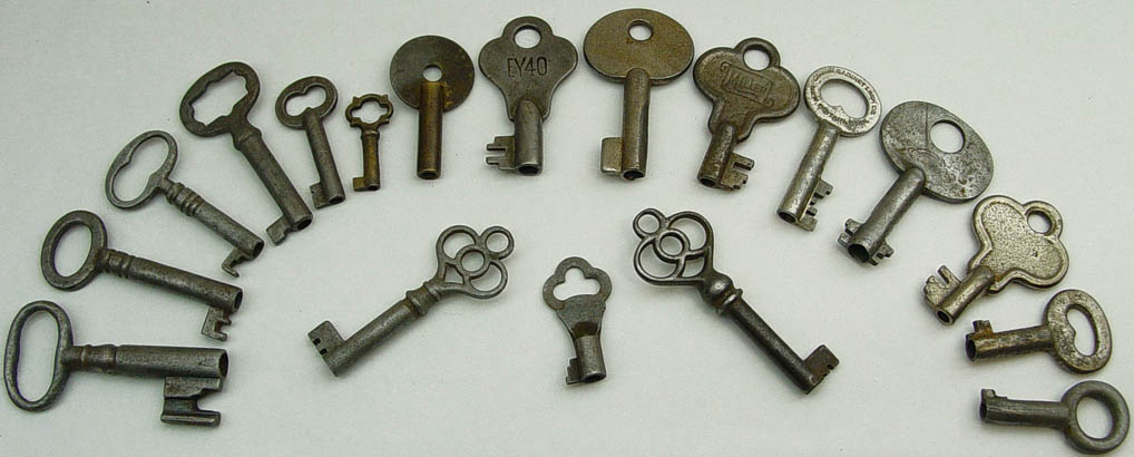 Title (ebay affiliate link): 18 Antique FURNITURE KEYS Small with HOLE On One END