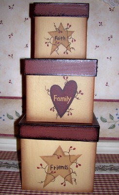 Title (ebay affiliate link): COUNTRY PRIMITIVE SHAKER BOXES FAITH FAMILY FRIENDS HEART STAR GIFT