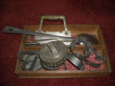 Title (ebay affiliate link): Antique Primitive Kitchen Bakery Utensils & Wooden Caddy Cookie Cutters