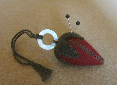 Title (ebay affiliate link): Primitive Wool *Strawberry Emery* Pincushion Pinkeep MOP Thread Ring Fob PRHG