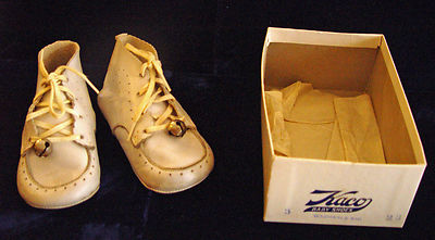 Title (ebay affiliate link): Antique/Vintage KACO Kid Leather Baby / Doll Shoes with Bells(!) and ORIG. box