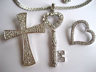 Title (ebay affiliate link): VTG Monet Herringbone Silvertone Chain ~ 3 Rhinestone Pendants ~ Heart Key Cross