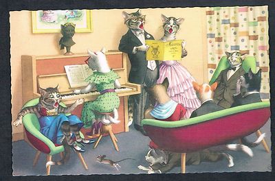 Title (ebay affiliate link): Alfred Mainzer Family Sing-A-Long Postcard Dressed Cats #4892 Belguim