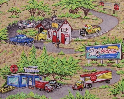 NEW RARE COCA COLA FABRIC 4 YDS. RETRO CARS TRUCKS DINER BEAR SEMIS BILLBOARDS