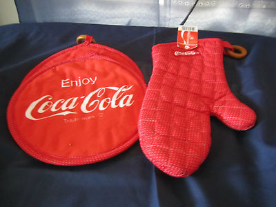 Title (ebay affiliate link): Coca Cola Oven Mitt & two 8 1/4" round pot holders1984 50% cotton & 50% polyeste