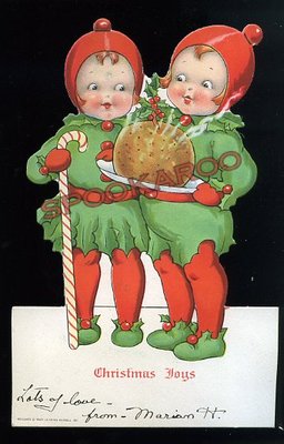 Title (ebay affiliate link): 1917 Die Cut Kids Dressed as Christmas Elves or Maybe It's Elves Dressed as Kids