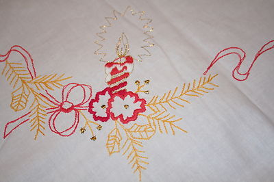 Vintage German CHRISTMAS tablecloth sparkling threads lighted candle