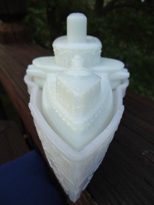 Title (ebay affiliate link): Old Milk Glass Battleship Maine Covered Candy Dish w/ Boat Lid