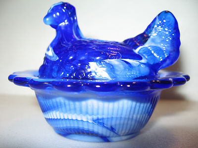 Title (ebay affiliate link): Cobalt blue & milk slag glass salt cellar hen chicken on nest basket dish white