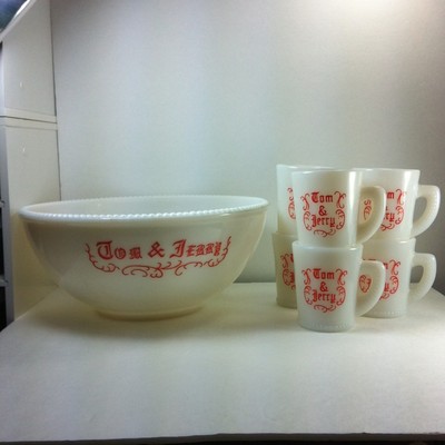 McKee Milk Glass Tom & Jerry Punch Bowl & 6 Mug Set