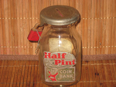 Title (ebay affiliate link): VINTAGE Half Pint Glass Milk Jar COIN BANK WITH ORIGINAL LOCK & KEY GOSHEN RARE
