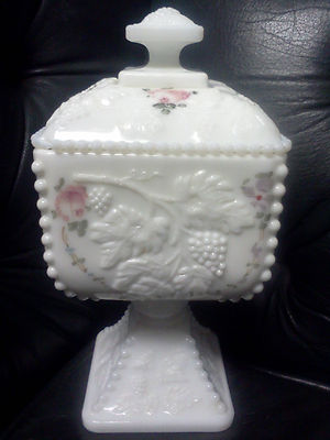 Title (ebay affiliate link): Westmoreland PAINTED Milk Glass Paneled Beaded Grape Covered Dish Pedestal