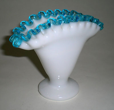 Title (ebay affiliate link): Vintage FENTON Aqua Blue Ruffled Crest Milk Glass Fan Vase (Lot Y 23)