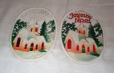 Lot of 2 Vintage Antique German Die Cut Cardboard Christmas Church Joyeux Noel