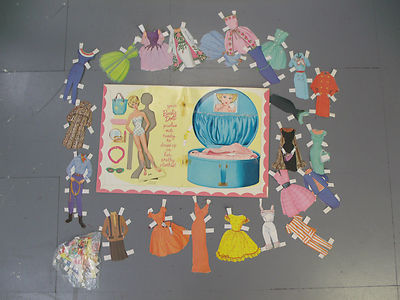 Title (ebay affiliate link): Vintage 1957 1962 Whitman Barbie Doll Cut-Outs clothes suitcase dresses and more