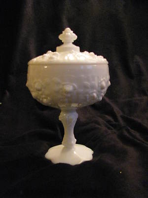 Title (ebay affiliate link): Fenton white milk glass candy dish with lid with cabbage rose bud design