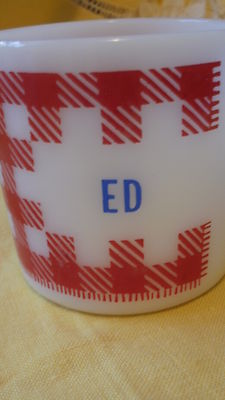 Title (ebay affiliate link): Westfield Milk Glass Coffee Cup/mug, ED, Red White Gingham Plaid