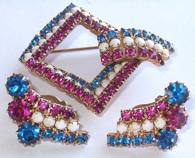 Title (ebay affiliate link): Vintage rhinestone & milk glass red white blue jewelry brooch pin earrings set