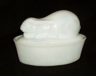 WHITE MILK GLASS RESTING RABBIT COVERED OVAL DISH