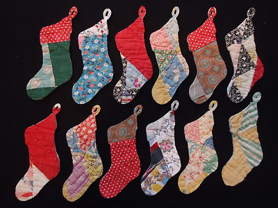 Title (ebay affiliate link): 12 PRIMITIVE VTG CUTTER QUILT CHRISTMAS SANTA STOCKINGS - FOLK ART