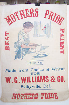 Title (ebay affiliate link): VINTAGE MOTHERS PRIDE WHEAT FLOUR CLOTH BAG -/W.G. WILLIAMS & CO. SELBYVILLE, DE