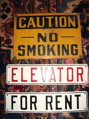 ENAMEL NO SMOKING SIGN PLUS STEEL RENT AND ELEVATOR ADVERTISING SIGNS