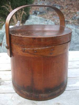Title (ebay affiliate link): Old New England Wooden Firkin Bucket Primitive Handle & Lid