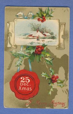 Title (ebay affiliate link): Vintage PC: Christmas holly with winter scene painting 25 Dec. Xmas UNUSED