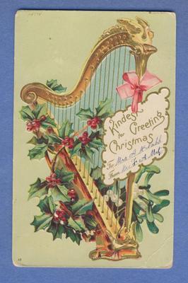 Title (ebay affiliate link): Vintage PC: Christmas holly/mistletoe with harp and pink; International Art Pub.