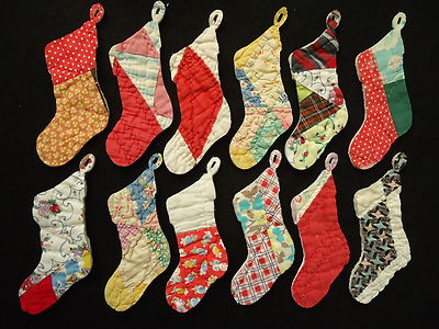 Title (ebay affiliate link): 12 PRIMITIVE VTG CUTTER QUILT CHRISTMAS SANTA STOCKINGS - FOLK ART