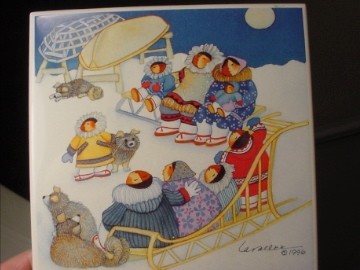 Title (ebay affiliate link): Barbara Lavallee Dog Sled Sleigh Eskimo Alaska Colorful ART TILE Trivet Plaque