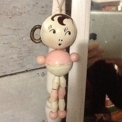 Title (ebay affiliate link): Vintage Hand Painted Hard Plastic Figural Baby Rattle Crib Toy