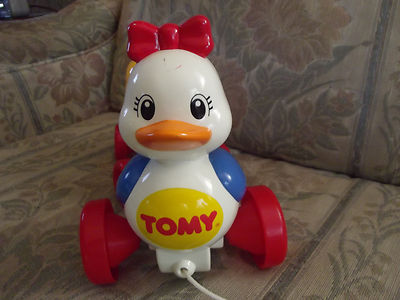 Title (ebay affiliate link): MAMA DUCK WITH BABIES PULL TOY WITH QUACKING SOUND/SONG. FROM TOMY. 1995