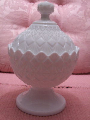 Title (ebay affiliate link): VINTAGE FOOTED MILK GLASS COVERED COMPOTE/CANDY DISH - Diamond Pattern with Fans