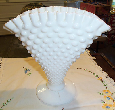 FENTON MILK GLASS FAN VASE HOBNAIL 7 3/4" TALL