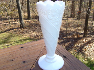 Title (ebay affiliate link): Antique Milk Glass Bud Vase~ Beads, Stars and Scroll Pattern