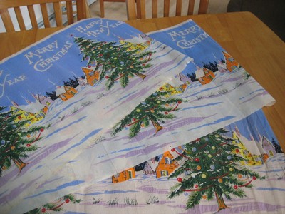 Title (ebay affiliate link): VINTAGE XMAS CREPE PAPER DECORATIONS Tree and Village Winter Scene
