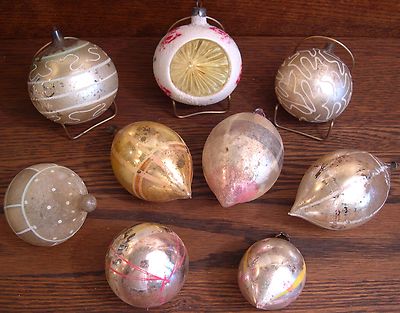 Title (ebay affiliate link): 9 Antique Christmas Glass Ornaments Hand-Painted Gold, Silver, White, 1 Indent